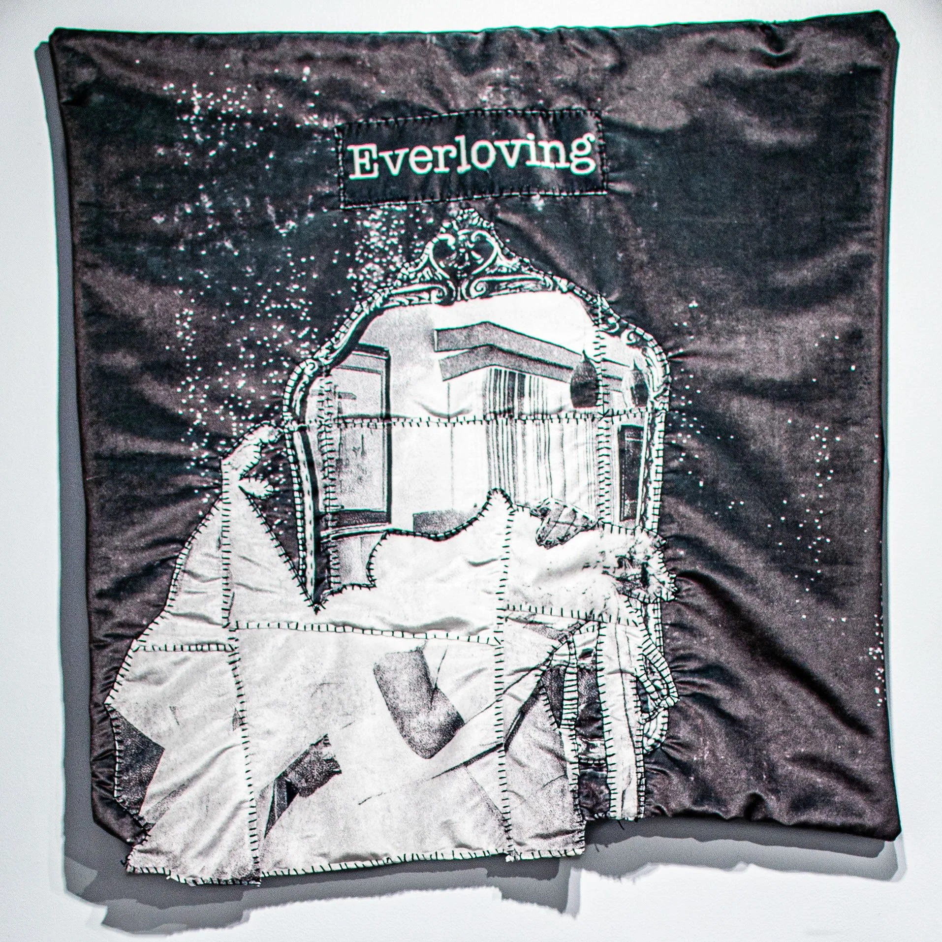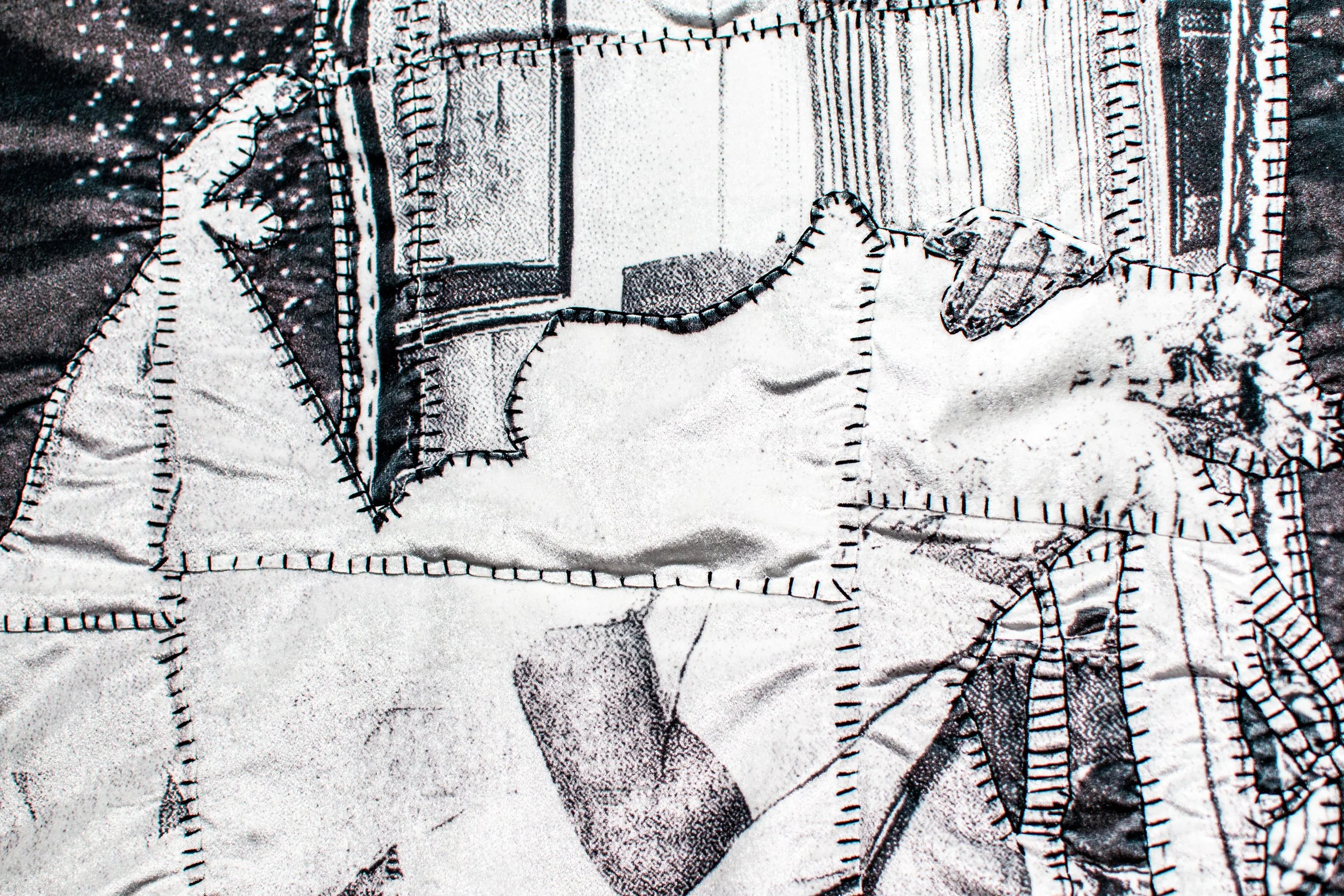 Medium: Digital thermal print scans printed on velvet, cotton thread, vinyl, batting. Handsewn.